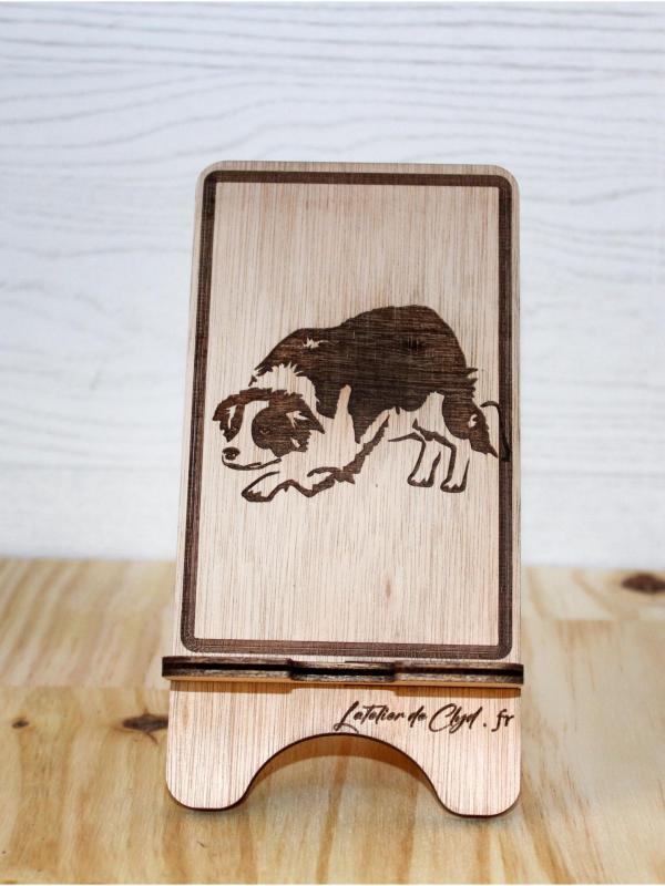 Support de téléphone en bois, élaboré dans nos ateliers.